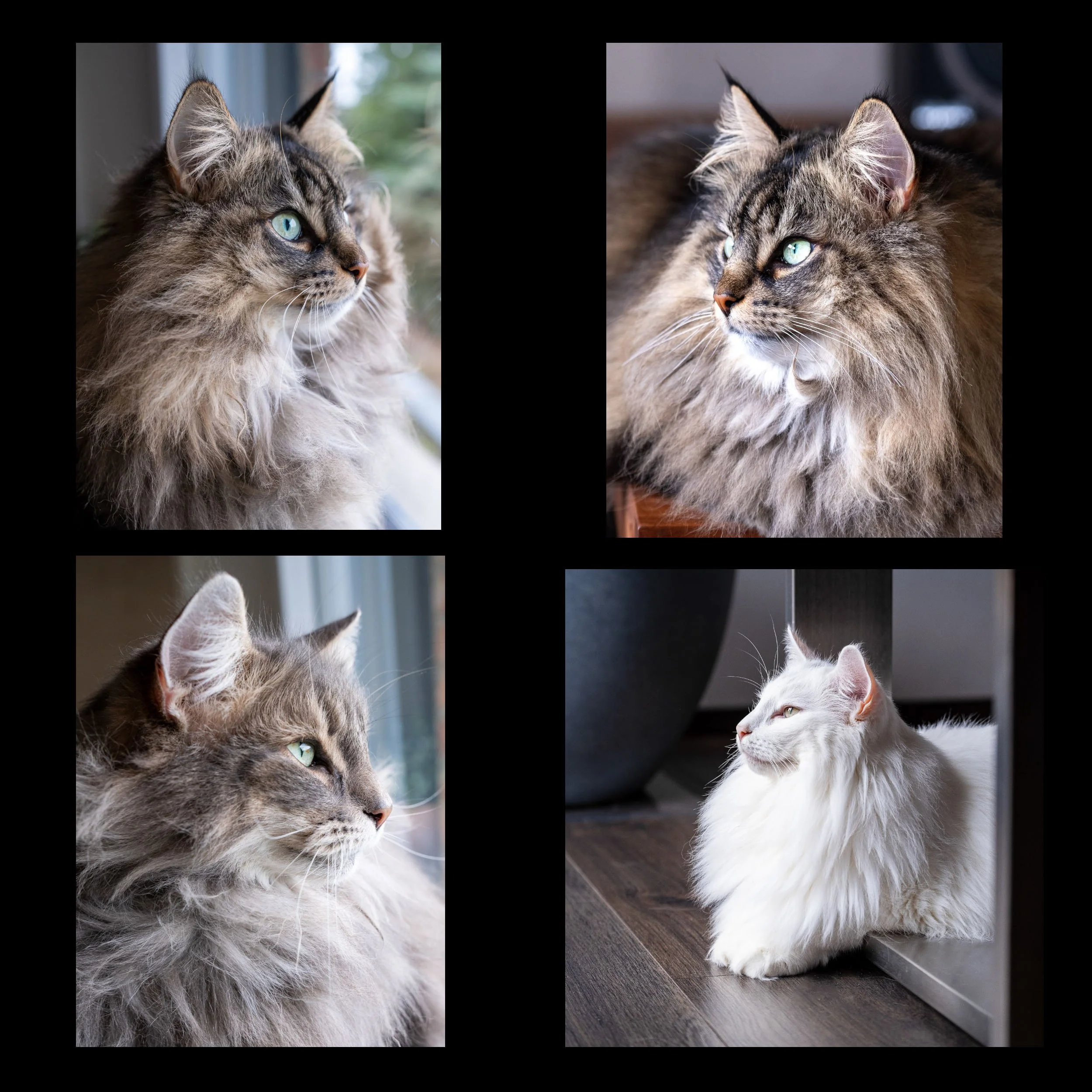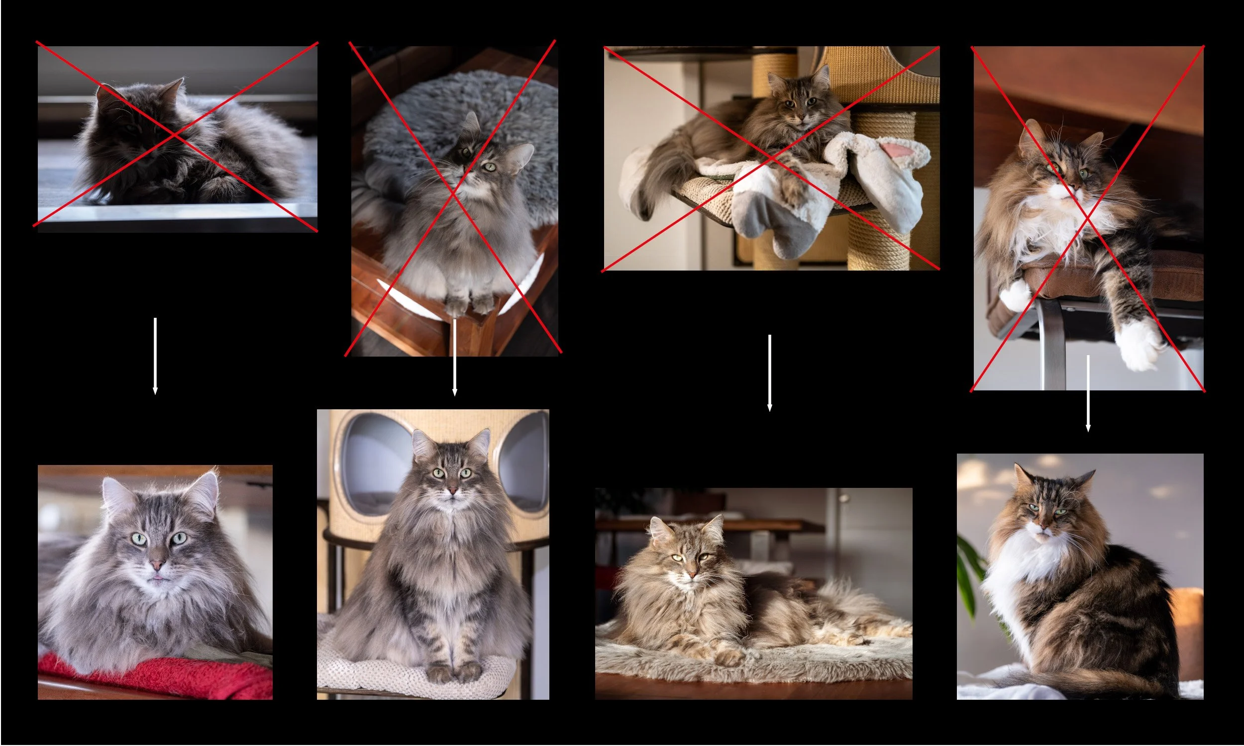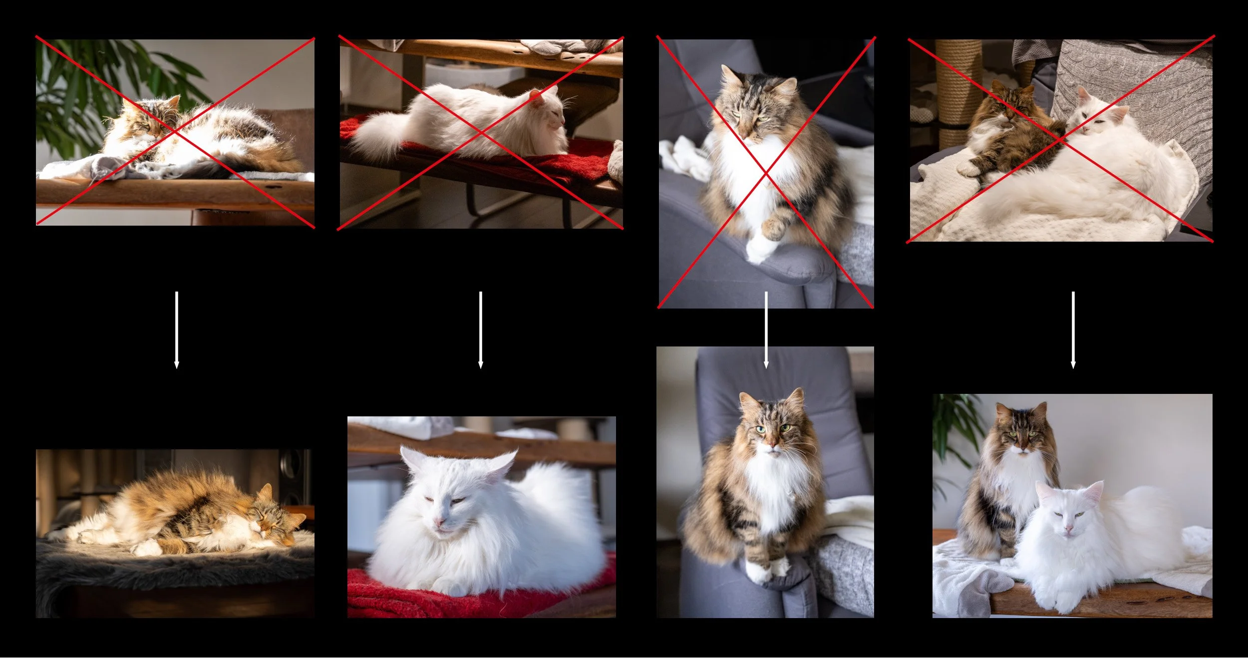 Das vierte Bild zeigt eine stimmige Beleuchtung, aber der Winkel ist von unten aufgenommen und somit weniger geeignet. Das untere Bild zeigt hingegen beide Katzen mit Blick in die Kamera. Der Betrachtungswinkel und die Beleuchtung sind ideal, was es zur besten Wahl für ein Gemälde macht.
